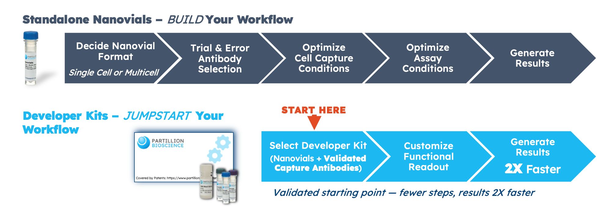 Yes! Developer Kits support both Single Cell and Multicell applications. Build your own kit—choose your Nanovial size and cell capture antibodies. Options are available for Human, Mouse, and CHO cells, and additional Nanovial workflow reagents are included so you can start right away!