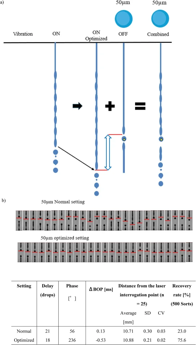 Flow cytometry is a critical technology for single-cell analysis; however, sorting large particles (> 30 μm) remains challenging owing to low recovery rates. This study investigated the relationship between particle size and the Break-off point (BOP) and assessed the impact of large particles on droplet formation through a combination of simulations and experiments. The results revealed that interference between the particle-induced BOP and vibration-driven BOP leads to droplet instability—identified as the key factor limiting recovery. We introduce ΔBOP as the difference between these two BOPs and propose an optimization strategy to stabilize droplet formation. Implementing this ΔBOP-based approach increased recovery from 72.2% (794/1100) to 92.4% (1016/1100) for 35-µm particles and from 23.0% (115/500) to 75.6% (378/500) for 50-µm particles. This strategy demonstrates broad applicability for high-throughput single-cell functional analyses involving various particle types, including hydrogel particles, double emulsions, and agarose beads, and opens new possibilities for applications such as secretion profiling and intercellular communication research.